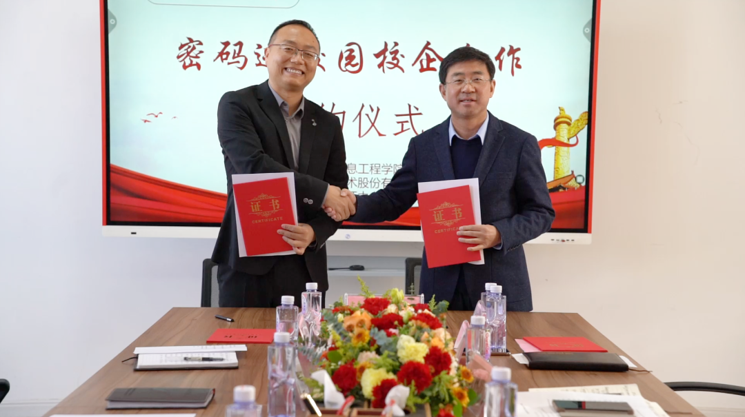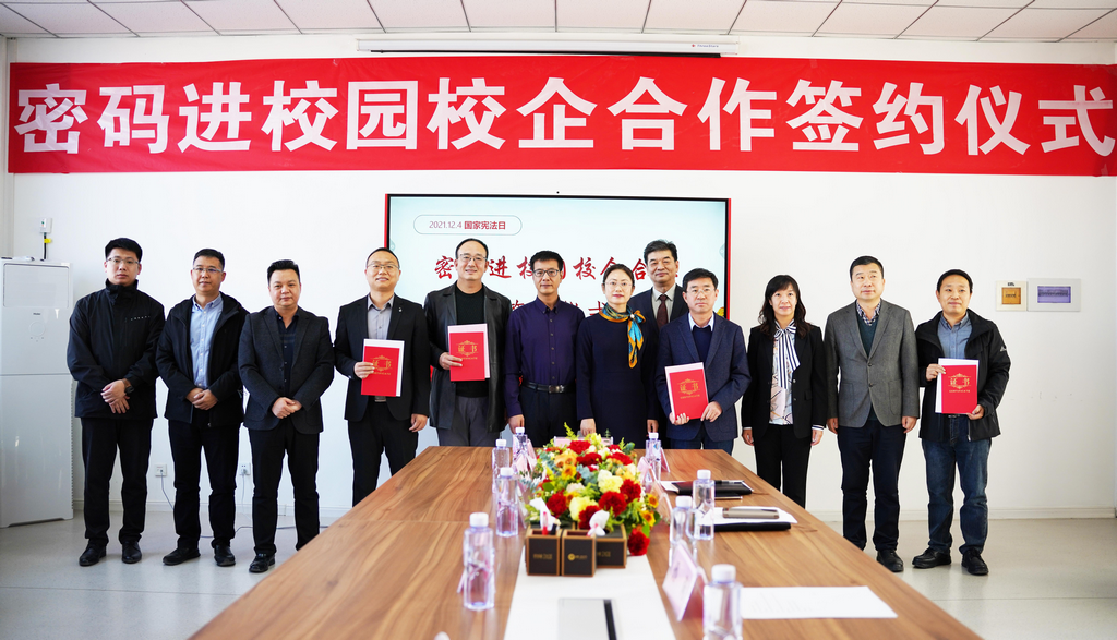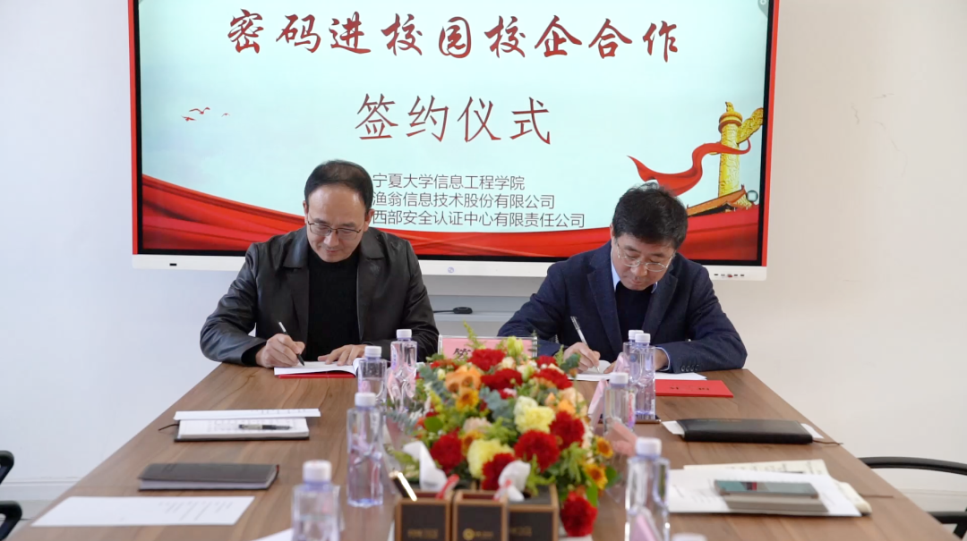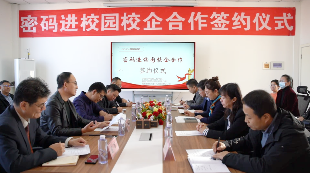 在第八个国家宪法日来临之际,为深入贯彻落实《中华人民共和国密码法》,进一步加快密码专业人才队伍建设步伐,打通我区密码产学研创新链、价值链,12月1日,“密码进校园校企合作签约仪式”在宁夏大学信息工程学院成功举行。此次签约仪式由宁夏密码管理局指导,宁夏商用密码协会会员单位LEHU乐虎信息技术股份有限公司、西部安全认证中心有限责任公司同宁夏大学信息工程学院签署战略合作协议,共同为我区密码学科建设、密码实训基地建设、密码人才培养贡献力量。宁夏密码管理局副局长李大苞,商密处副处长丁杰,宁夏大学信息工程学院党委书记武林波、院长冯锋、副书记孙莉、副院长杨军、学科主任李贯峰,LEHU乐虎信息技术股份有限公司董事长郭刚,西部安全认证中心有限责任公司常务副总经理耿方,区内其他商密企业代表等出席了签约仪式,签约仪式由宁夏商用密码协会秘书长赵军主持。